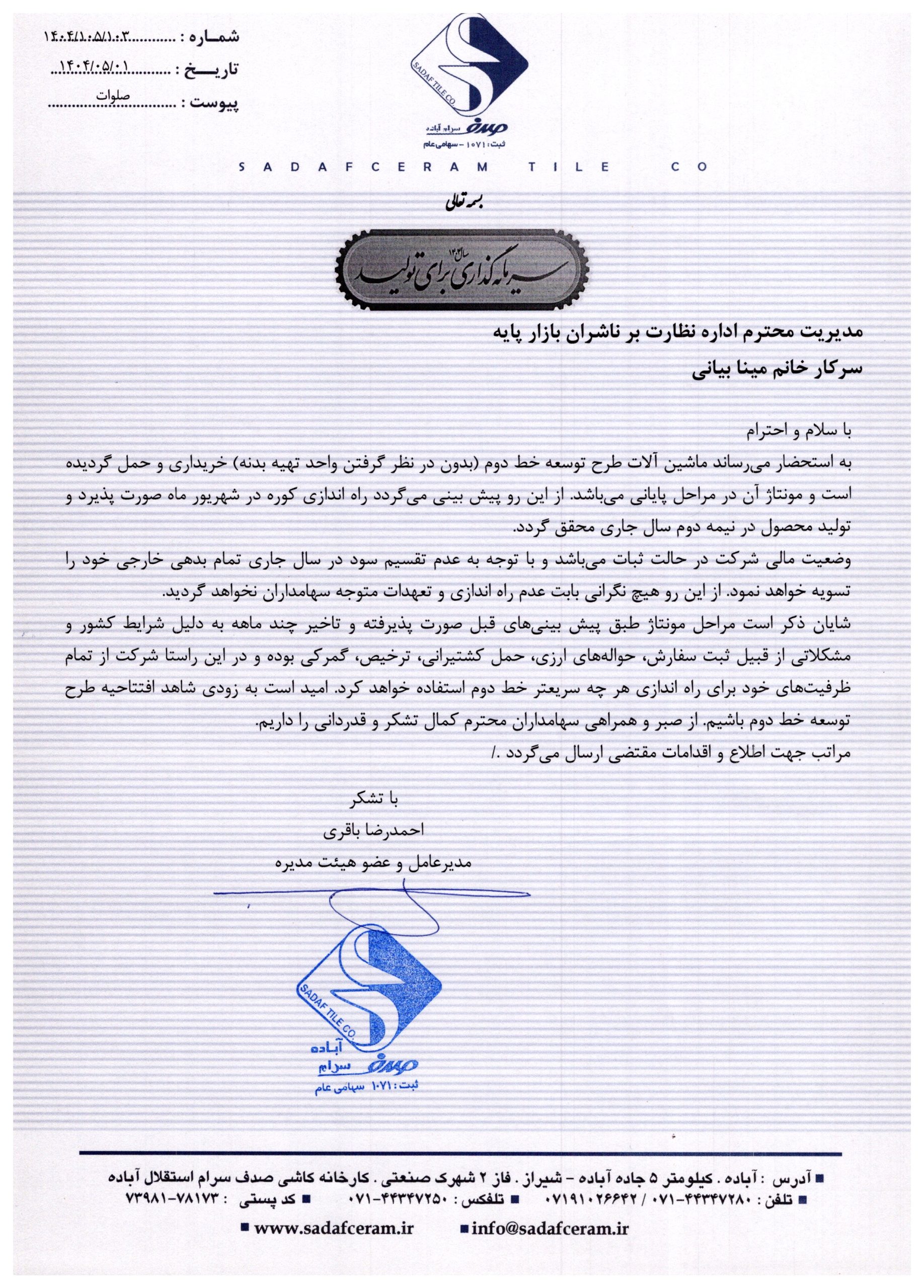 شفاف سازي در خصوص راه اندازي طرح توسعه خط دوم شرکت کاشي صدف سرام استقلال آباده (کصدف)